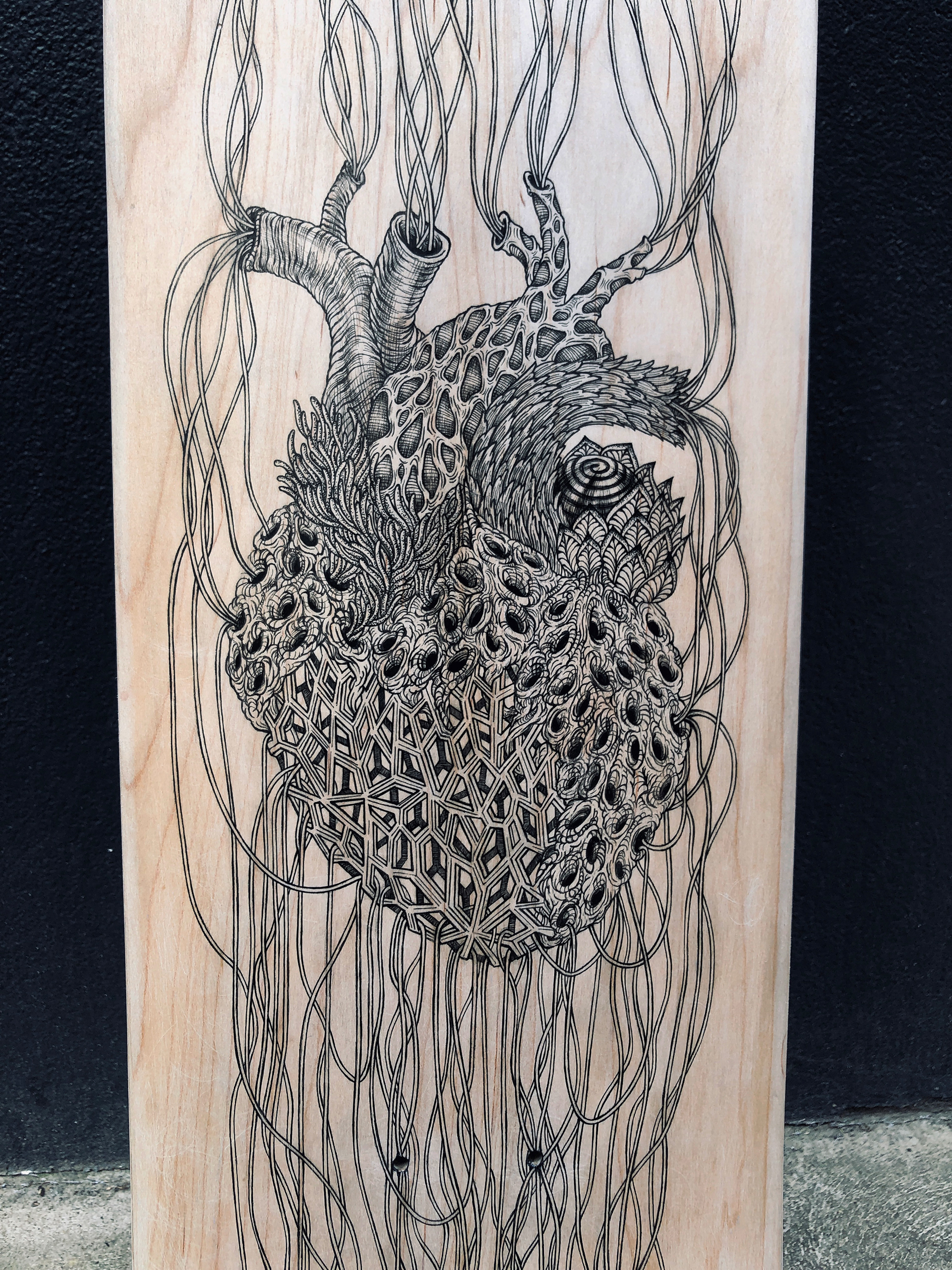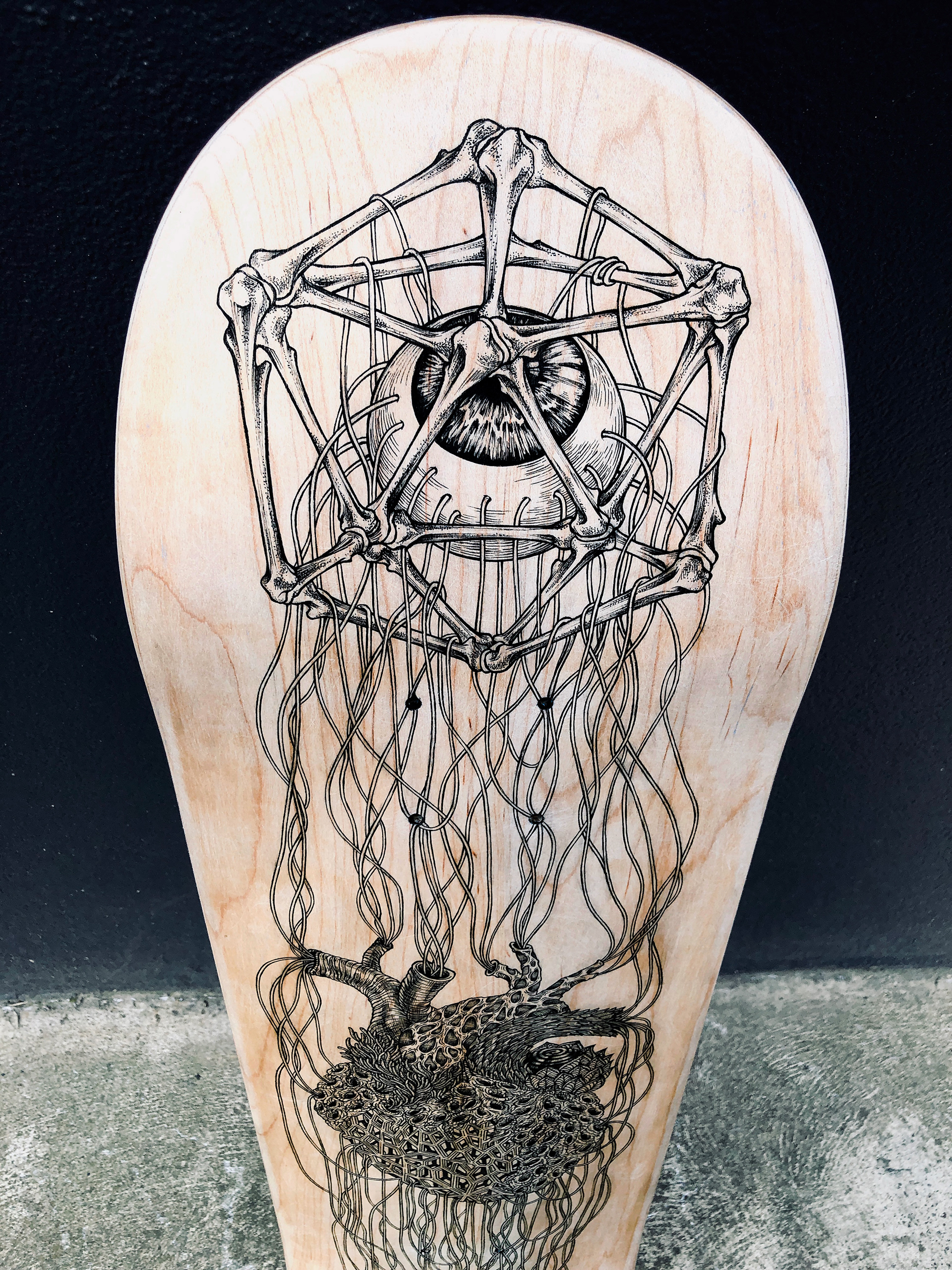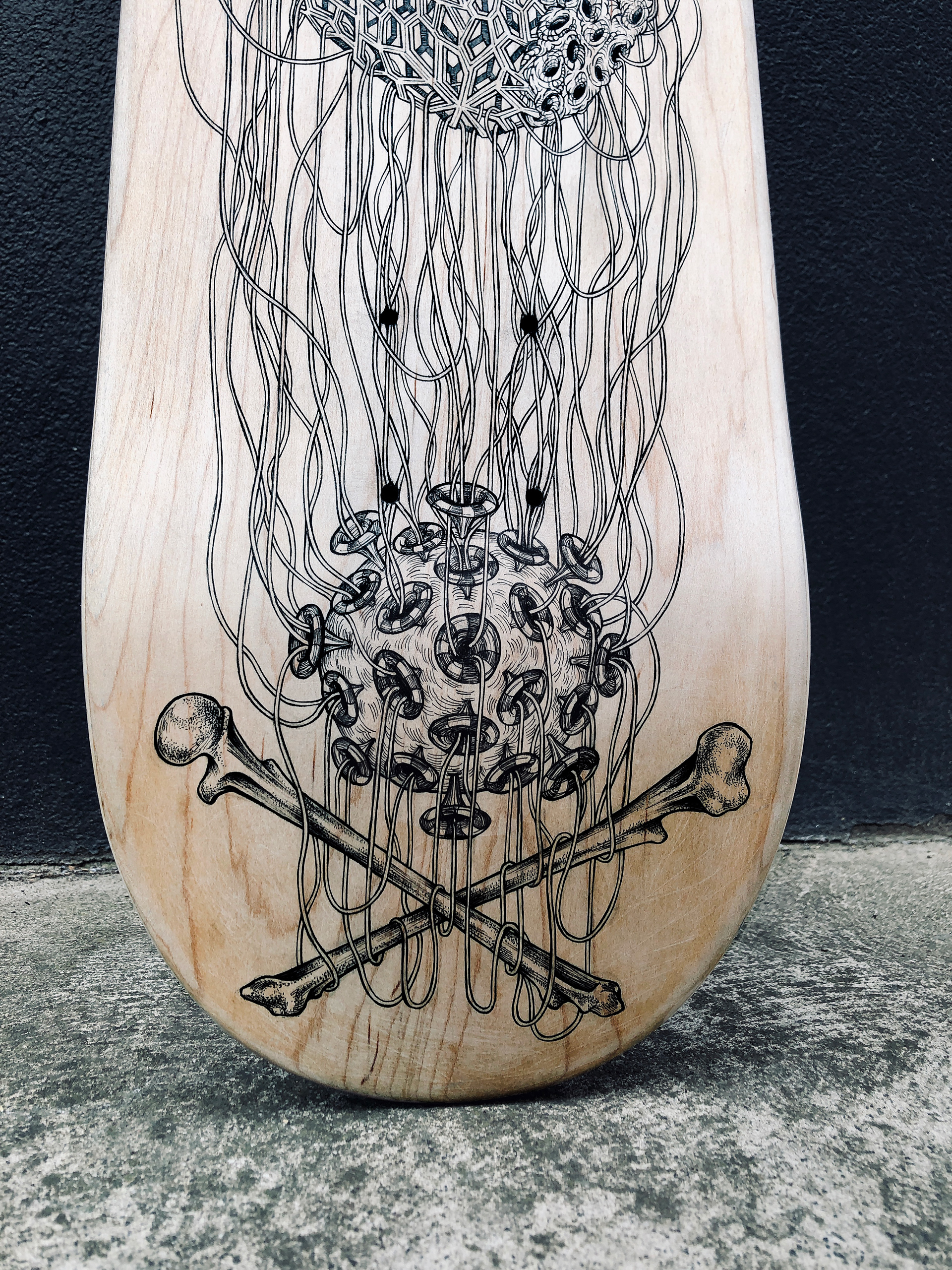 Freehand skateboard deck artĀ for the Moss Foundation Deck Art Show, 2020 Charity Art Auction